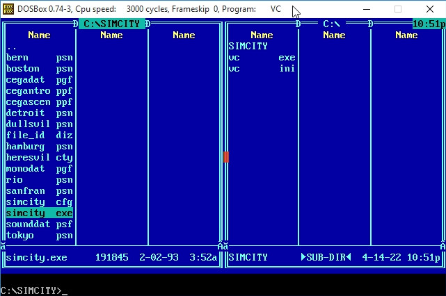 4. Indítsd el a DOSBox-ot és a Volkov Commander-ben használd az iránybillentyűket hogy a "simcity" mappa legyen kijelölve.